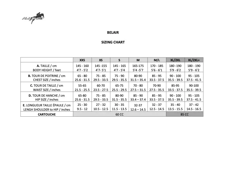 ALLSHOT Belair airbag vest is the second generation of the equestrian airbag and holds the latest AFNOR certification S72-800:2022.  Meant to be fitted, this vest allies safety and elegance. Belair is compatible with ANY zipped jacket that has a minimum of 15% elastane. Belair is the most performant vest on the market and deploys in 80ms regardless of the size vest. The minimum weight of the rider is 66 pounds. This vest is mostly designed for dressage, hunter, and jumper riders. Belair is sold ready to wear with a D3O back protector, a saddle strap, 2 CO2 cartridgesÂ