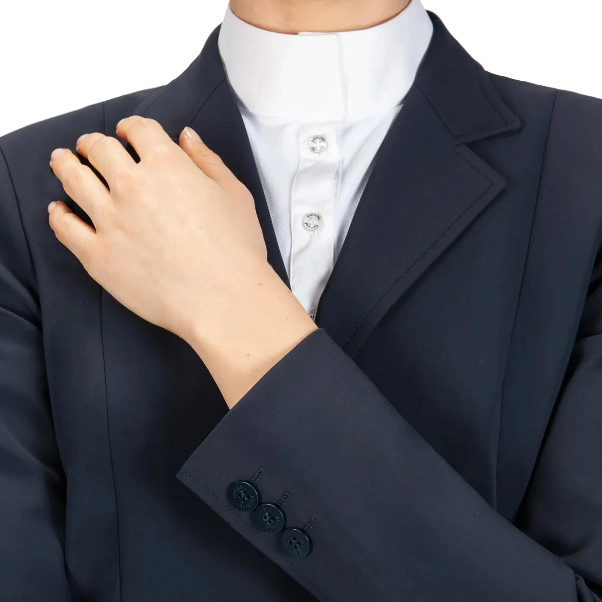 We love the Equiline Women’s Hayley Hunter Show Coat because it is traditionally styled for the Hunter and Equitation show ring. The coat is cut slightly longer than a standard competition jumping jacket and is tailored for a very flattering fit. The coat boasts Equiline’s proprietary X-Cool Evo 4-way stretch fabric, which allows for enhanced breathability and freedom of movement. The lightweight feel makes it ideal for equestrians competing in hot weather climates. Additional features include discreet branding, a double vent in the back, faux flap pockets in the front, and flat matte buttons.