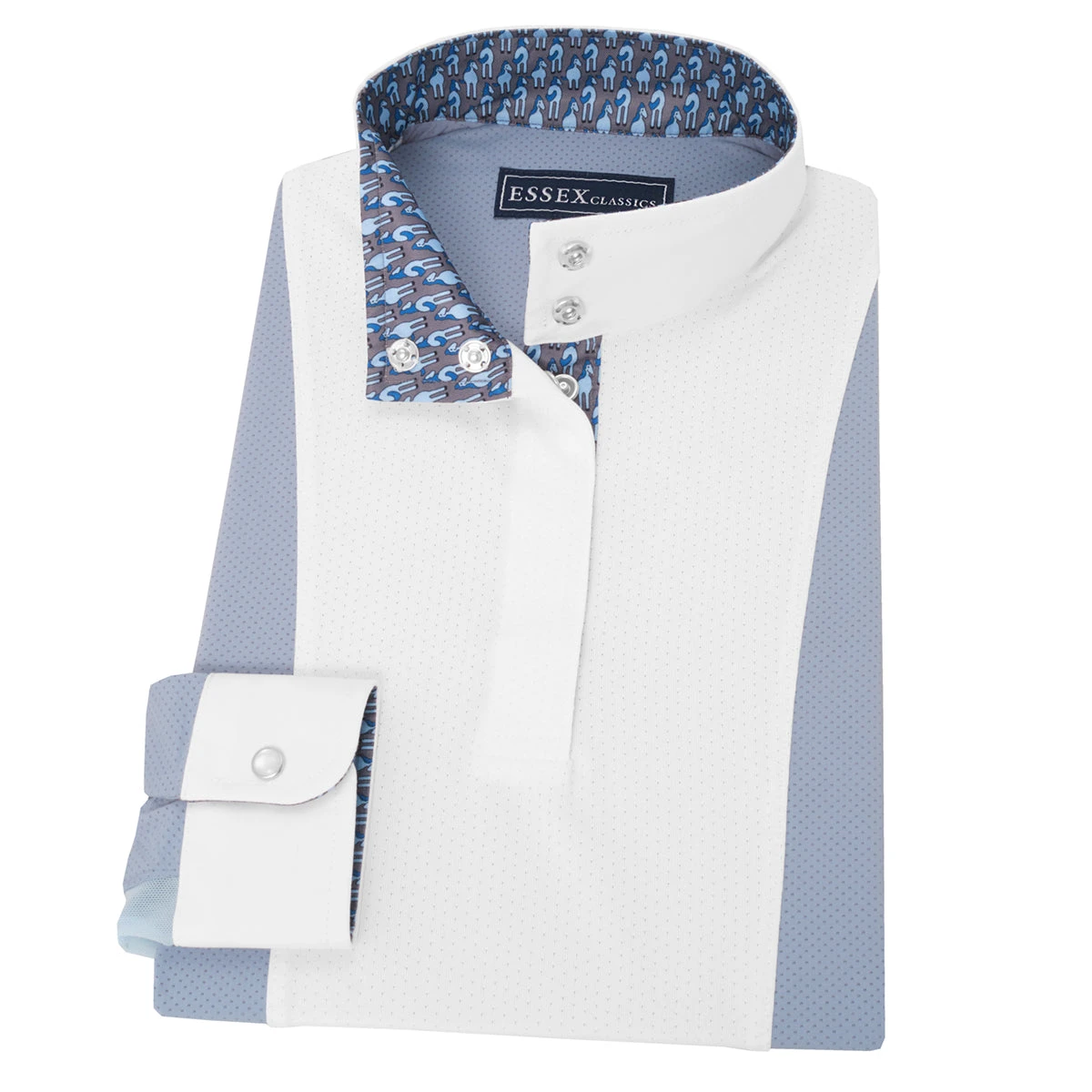 New this season, our Luna Performance show shirts artfully combine the classic good looks of a crisp white shirt in the show ring with a colorful appeal. Paired with a show coat, the white front panel, collar, and cuffs make a crisp, clean presentation in the ring. Without a coat, the color body provides a flattering feminine silhouette and the practical advantage of staying clean throughout the day. Expertly tailored of high-performance, moisture-wicking fabric with all the fine details you expect from Essex Classics, Luna is now available in 5 colors and a selection of fun trim options.