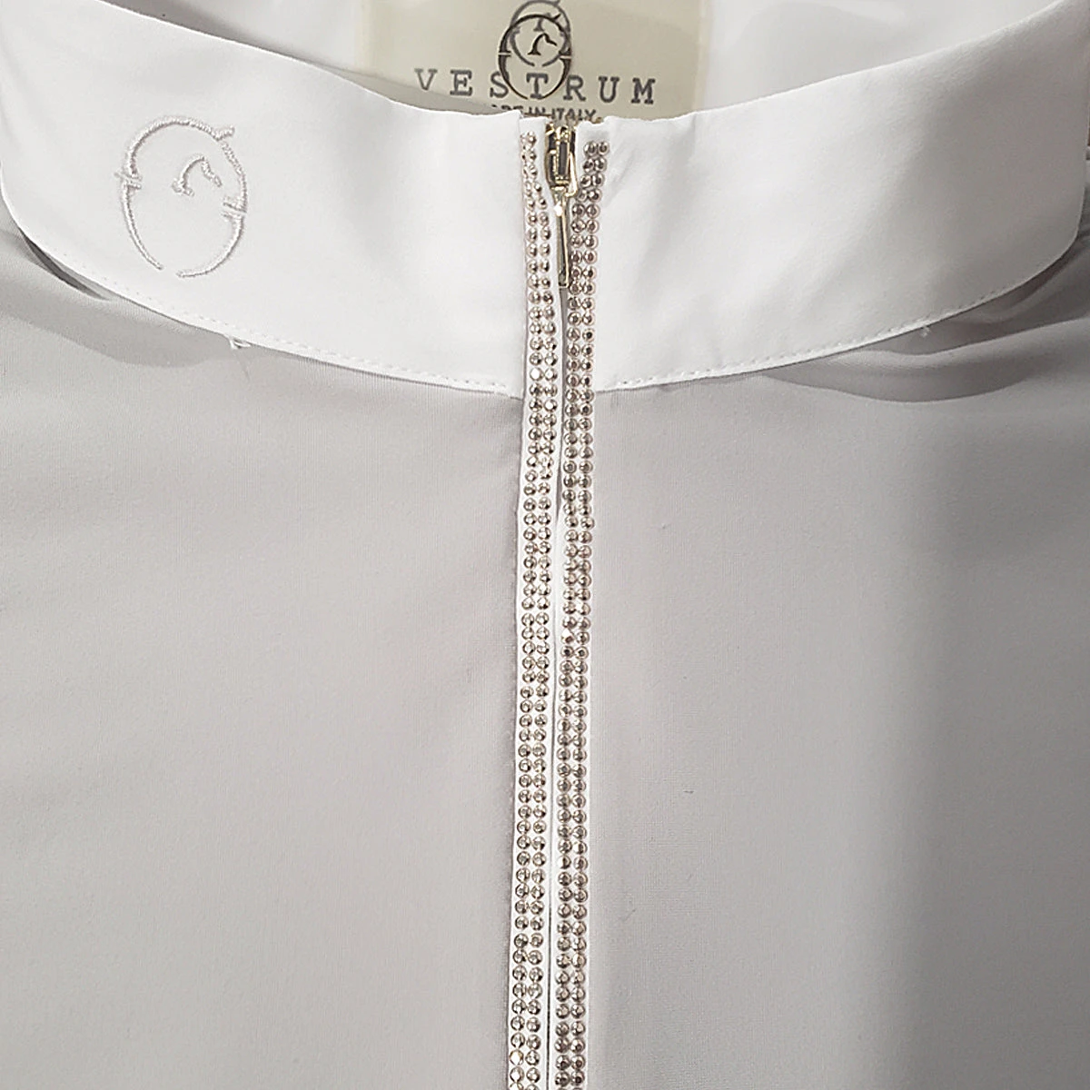 Women’s show shirt in bi-stretch technical fabric that makes the garment elastic and comfortable. The extreme fineness of the fabric makes the shirt highly feminine. Manarola differs from other shirts for the peculiarity of the shiny studs on the front of the garment that frame the half zip. Vestrum logo embroidered tone on tone.